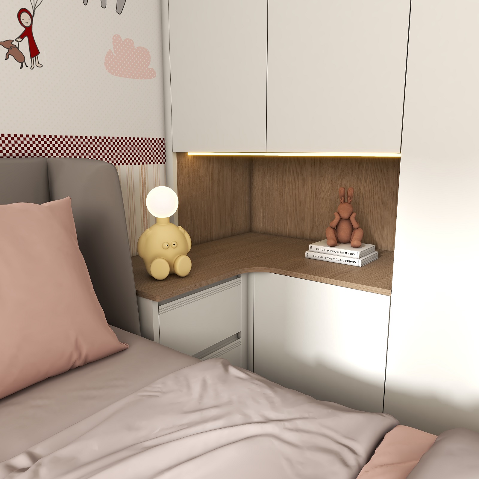 兒童房采用溫柔的奶白作為空間底色,整墻卡通貼畫搭配奶油白衣柜,在細節上用粉色裝飾作為跳色,無形中增加立體感和層次感,營造出童真舒適的兒童夢中情房。